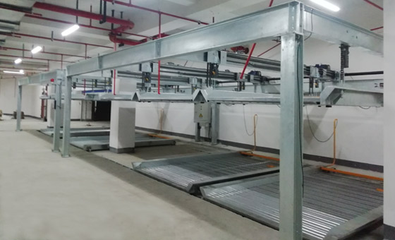 工作原理:每個車位均有載車板,所需存取車輛的載車板通過上升、下降、橫移等運動過程到達地面層,駕駛員進入車庫,存取車輛,完成存取過程。停泊在此類車庫內(nèi)地面層的車只作橫移,不必升降,上層車位或地坑下層車位需通過中間層橫移出空位,將載車板升或降到地面層,駕駛員才可以進入車庫內(nèi)將汽車開進或開出車庫。