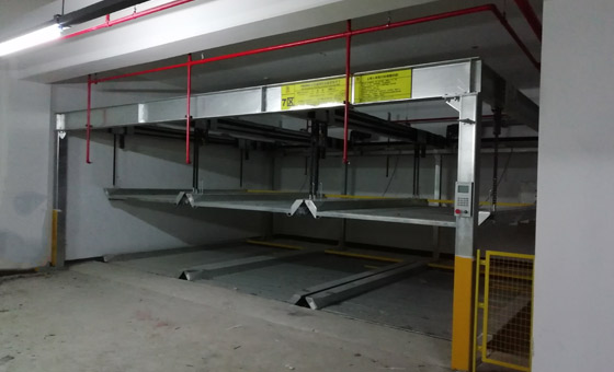工作原理:每個車位均有載車板,所需存取車輛的載車板通過上升、下降、橫移等運(yùn)動過程到達(dá)地面層,駕駛員進(jìn)入車庫,存取車輛,完成存取過程。停泊在此類車庫內(nèi)地面層的車只作橫移,不必升降,上層車位或地坑下層車位需通過中間層橫移出空位,將載車板升或降到地面層,駕駛員才可以進(jìn)入車庫內(nèi)將汽車開進(jìn)或開出車庫。